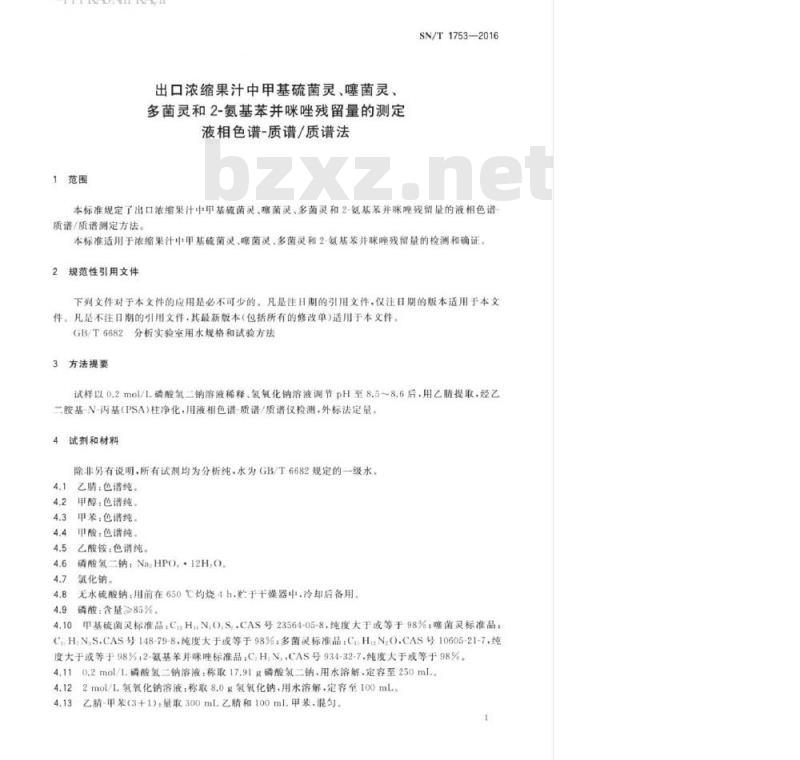 SN/T 1753规定了出口浓缩果汁中甲基硫菌灵、噻菌灵、多菌灵和2-氨基苯并咪唑残留量的液相色谱~质谱/质谱测定方法。