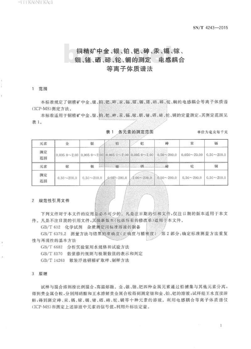 SN/T 4243规定了铜精矿中金、银、铂、钯、砷、汞、镉、镓、钢、错、硒、碲、铊、镧的电感耦合等离子体质谱(ICP-MS)测定方法。