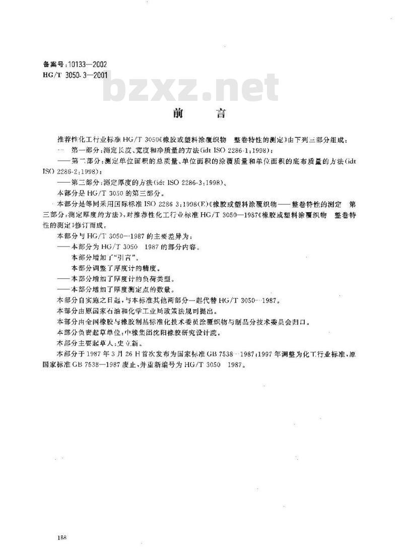 本部分增加了厚度计的负荷类型本部分增加了厚度测定点的数量。本部分白实施之日起,与本标准其他两部分一起代替HG/T3050-1987。本部分由原国家石油和化学工业局政策法规司提出。本部分由全国橡胶与橡胶制品标雄化技术委员涂覆织物与制品分技术委员会归口。本部分负责起草单位:中橡集团沈阳橡胶研究设计院。本部分主要起草人:史文新。