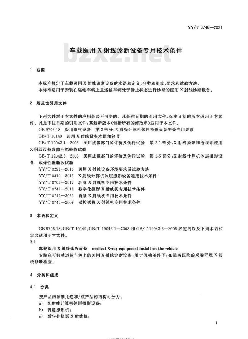 YY/T 0746-2021代替YY/T 0746-2009.Particular specifications for medical X-ray equipment install on the vehicle.