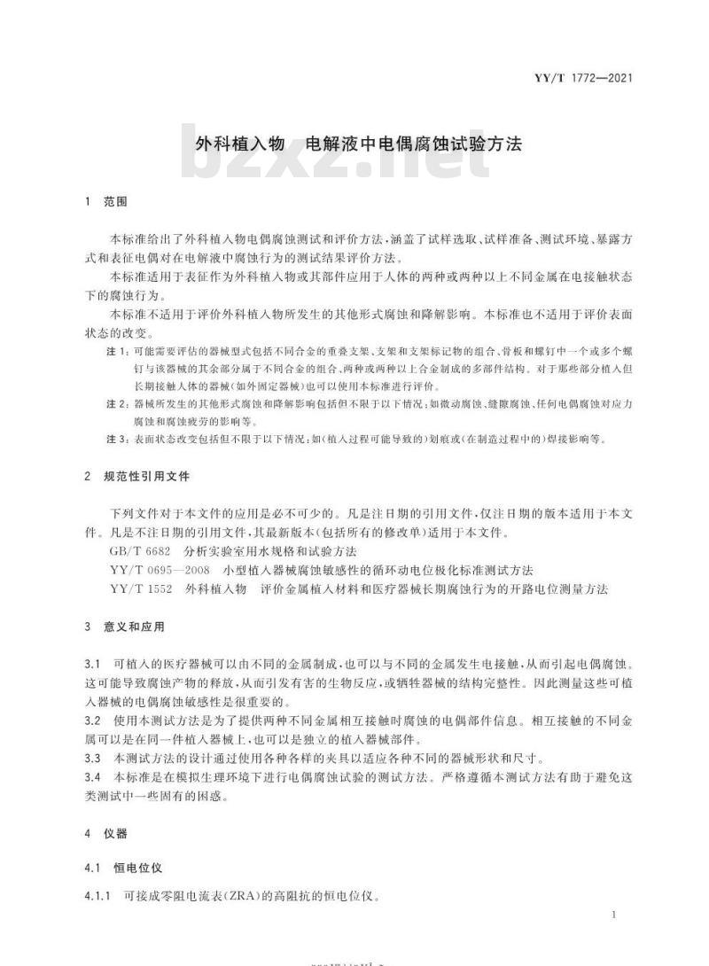 下列文件对于本文件的应用是必不可少的。凡是注日期的引用文件,仅注日期的版本适用于本文件。凡是不注日期的引用文件,其最新版本(包括所有的修改单)适用于本文件。GB/T6682分析实验室用水规格和试验方法YY/T0695—2008小型植入器械腐蚀敏感性的循环动电位极化标准测试方法YY/T1552外科植入物评价金属植人材料和医疗器械长期腐蚀行为的开路电位测量方法3意义和应用
