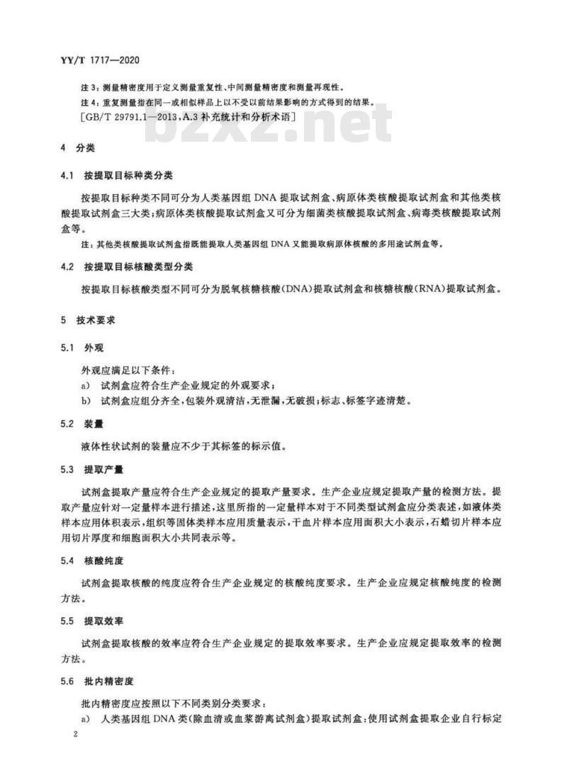 本标准规定了核酸提取试剂盒(磁珠法)(以下简称“试剂盒”)的术语和定义、分类、技术要求、试验方法、标识、标签和使用说明书、包装、运输和赠存等本标准适用于采用磁珠法从血清、血浆、全血、脑脊液、乳汁、唾液、尿液、痰液、拭子、组织或石蜡包埋组织等各类临床样本中提取、纯化人类基因组核酸及其片段、病原体核酸的试剂盒。病原体核酸包含脱氧核糖核酸(DNA)、核糖核酸(RNA)等。本标准不适用于不能将核酸提取产物取出进行检测的封闭式系统中包含的核酸提取试剂。2规范性引用文件下载标准就来标准下载网