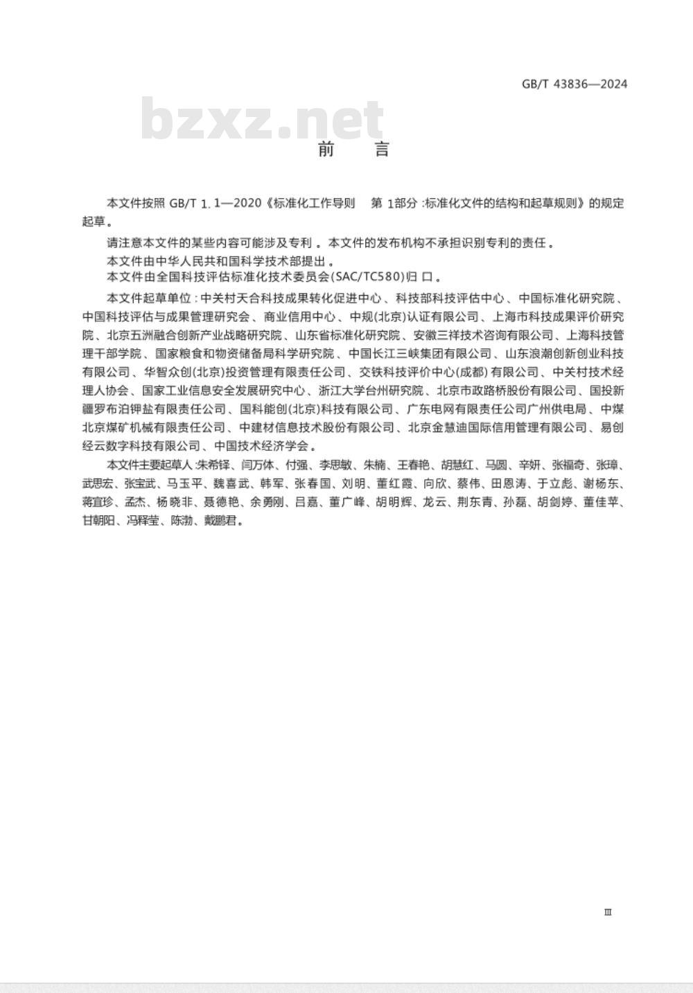 请注意本文件的某些内容可能涉及专利。本文件的发布机构不承担识别专利的责任。本文件由中华人民共和国科学技术部提出本文件由全国科技评估标准化技术委员会(SAC/TC580)归口。本文件起草单位:中关村天合科技成果转化促进中心、科技部科技评估中心、中国标准化研究院、中国科技评估与成果管理研究会、商业信用中心、中规(北京)认证有限公司、上海市科技成果评价研究院、北京五洲融合创新产业战略研究院、山东省标准化研究院、安徽三祥技术咨询有限公司、上海科技管理干部学院、国家粮食和物资储备局科学研究院、中国长江三峡集团有限公司、山东浪潮创新创业科技有限公司、华智众创(北京)投资管理有限责任公司、交铁科技评价中心(成都)有限公司、中关村技术经理人协会、国家工业信息安全发展研究中心、浙江大学台州研究院、北京市政路桥股份有限公司、国投新疆罗布泊盐有限责任公司、国科能创(北京)科技有限公司、广东电网有限责任公司广州供电局、中煤北京煤矿机械有限责任公司、中建材信息技术股份有限公司、北京金慧迪国际信用管理有限公司、易创经云数字科技有限公司、中国技术经济学会。本文件主要起草人朱希铎、闫万体、付强、李思敏、朱楠、王春艳、胡慧红、马圆、辛妍、张福奇、张璋武思宏、张宝武、马玉平、魏喜武、韩军、张春国、刘明、董红霞、向欣、蔡伟、田恩涛、于立彪、谢杨东、蒋宜珍、孟杰、杨晓非、聂德艳、余剪刚、昌嘉、董广峰、胡明辉、龙云、荆东青、孙磊、胡剑婷、董佳苹、甘朝阳、冯释莹、陈渤、戴鹏君。GB/T43836—2024