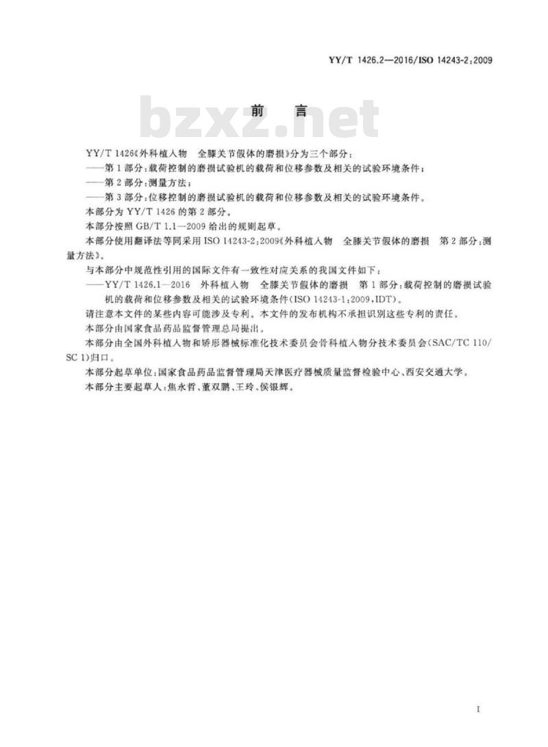 YY/T1426.1一2016外科植人物全膝关节假体的磨损机的载荷和位移参数及相关的试验环境条件(ISO14243-1:2009,IDT)请注意本文件的某些内容可能涉及专利。本文件的发布机构不承担识别这些专利的责任,本部分由国家食品药品监督管理总局提出。本部分由全国外科植人物和矫形器械标准化技术委员会骨科植人物分技术委员会(SAC/TC110)SC1归口。