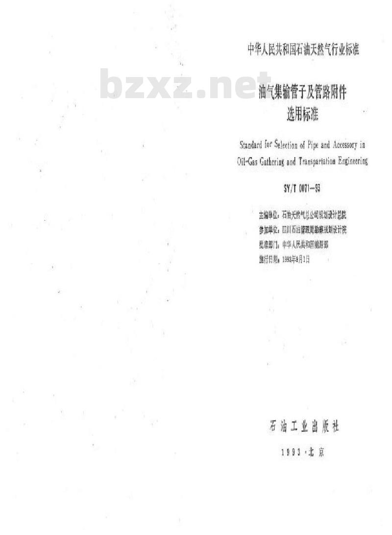 Stundard for Selection of Pipe and Aecessory inOil-gas Gatheriag and TranspattationEngieeringSY/T 0071-93