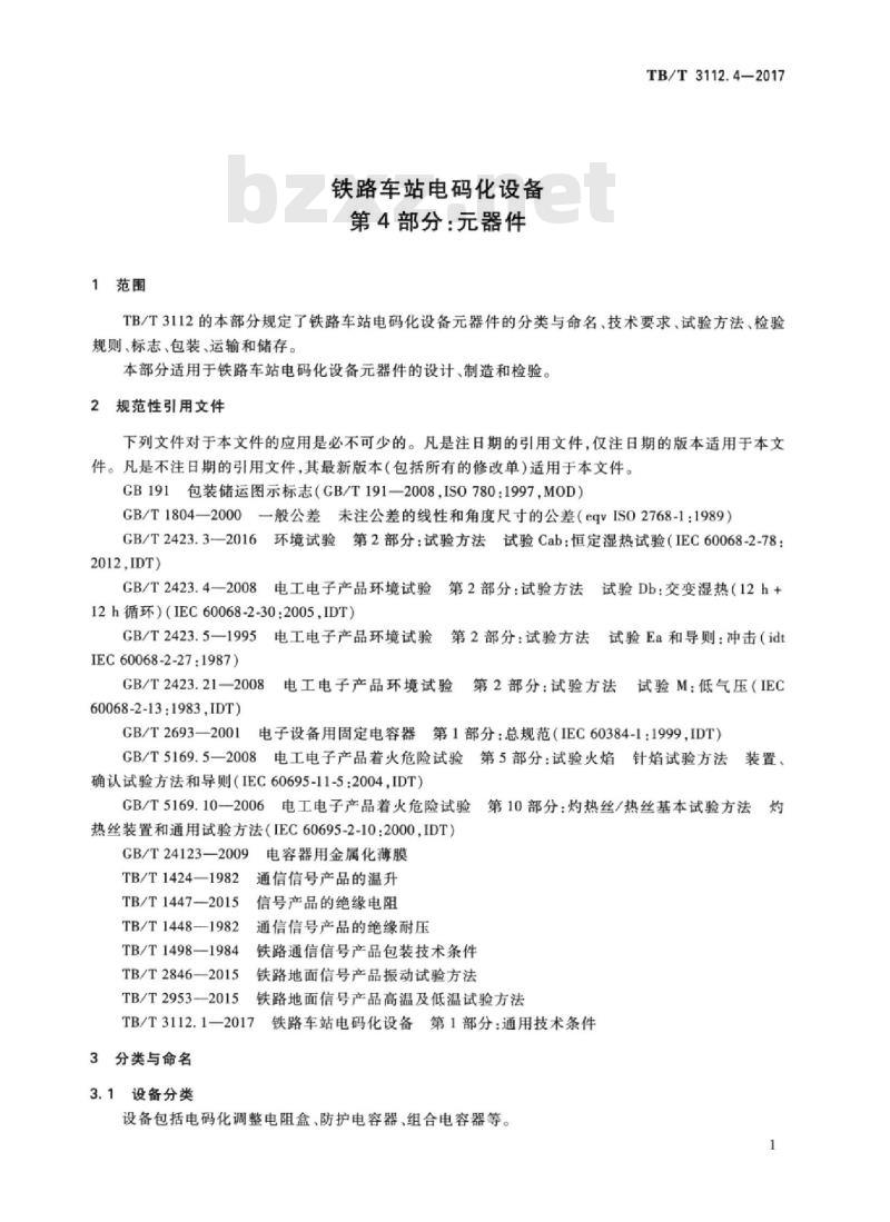 TB/T3112的本部分规定了铁路车站电码化设备元器件的分类与命名、技术要求、试验方法、检验规则、标志、包装、运输和储存。本部分适用于铁路车站电码化设备元器件的设计、制造和检验。2规范性引用文件