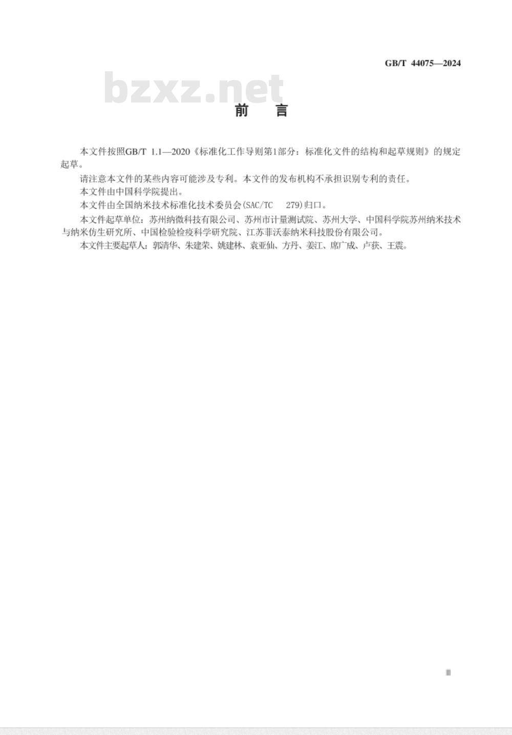 本文件起草单位:苏州纳微科技有限公司、苏州市计量测试院、苏州大学、中国科学院苏州纳米技术与纳米仿生研究所、中国检验检疫科学研究院、江苏菲沃泰纳米科技股份有限公司。本文件主要起草人:郭清华、朱建荣、姚建林、袁亚仙、方丹、姜江、席广成、卢获、王震。GB/T44075—2024