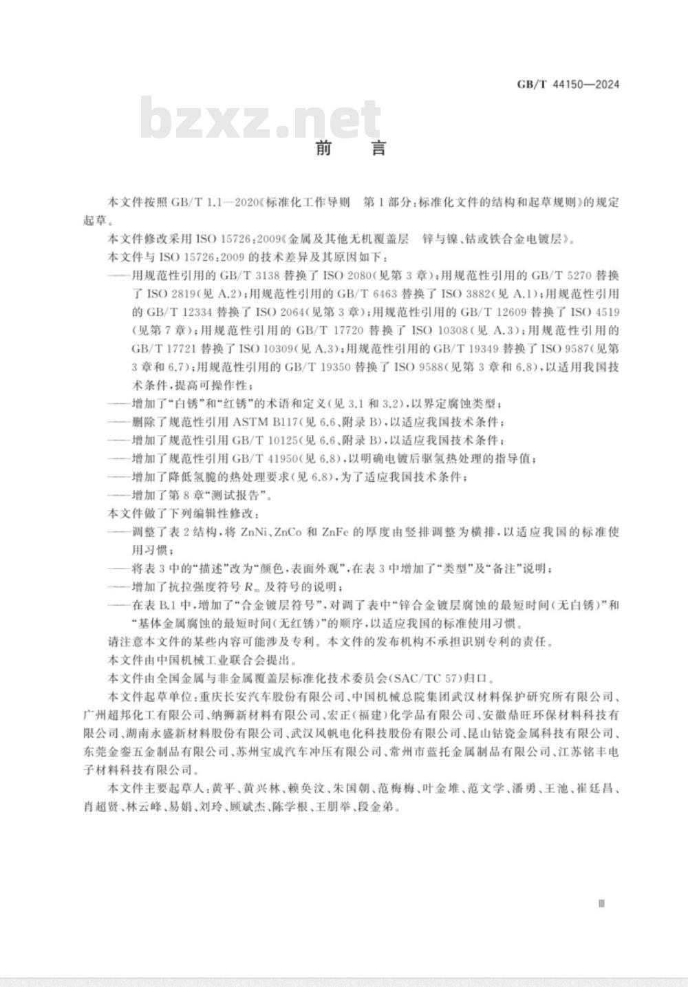 第1部分:标准化文件的结构和起草规则》的规定本文件修改采用IS015726:2009金属及其他无机覆盖层本文件与ISO15726:2009的技术差异及其原因如下:锌与镍、钻或铁合金电镀层》。用规范性引用的GB/T3138替换了ISO2080(见第3章);用规范性引用的GB/T5270替换了ISO2819(见A.2);用规范性引用的GB/T6463替换了ISO3882(见A.1);用规范性引用的GB/T12334替换了ISO2064(见第3章):用规范性引用的GB/T12609替换了ISO4519(见第7章):用规范性引用的GB/T17720替换了IS010308(见A.3);用规范性引用的GB/T17721替换了ISO10309(见A.3)用规范性引用的GB/T19349替换了ISO9587(见第3章和6.7);用规范性引用的GB/T19350替换了ISO9588(见第3章和6.8),以适用我国技术条件,提高可操作性;