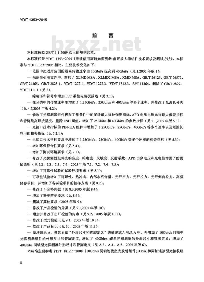 本标准按照GB/T1.1-2009给出的规则起草本标准代替YD/T1353-2005《光通信用高速光探测器-前置放大器组件技术要求及测试方法》。本标准与YD/T1353-2005相比,主要技术变化如下:一范围中把适用范围的最高传输速率由10Gbit/s提高到40Gbit/s(见1,2005年版1);一规范性引用文件中,增加了XLMDMSA、XLMD2MSA、XMDMSA、GB/T26125、GB/T26572、GB/T24365、GB/T2828.1、YD/T1272.1、YD/T1272.3、YD/T1812.3、SJ/T11364、删除了GB/T2829、YD/T1111.1(见2);
