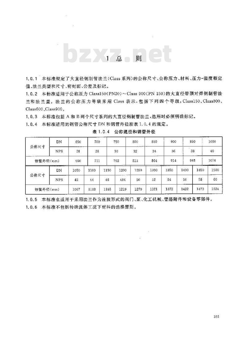 1.0.1本标准规定了大直径钢制管法兰(Class系列)的公称尺寸、公称压力、材料、压力-温度额定值、法兰类型和尺寸、密封面、公差及标记。1.0.2本标准适用于公称压力Clas150(PN20)~Class900(PN150)的大直径带颈对焊钢制管法兰和法兰盖:法兰的公称压力等级采用Class表示,包括下列四个等级:Class150,Class300,Class600,Class900.
