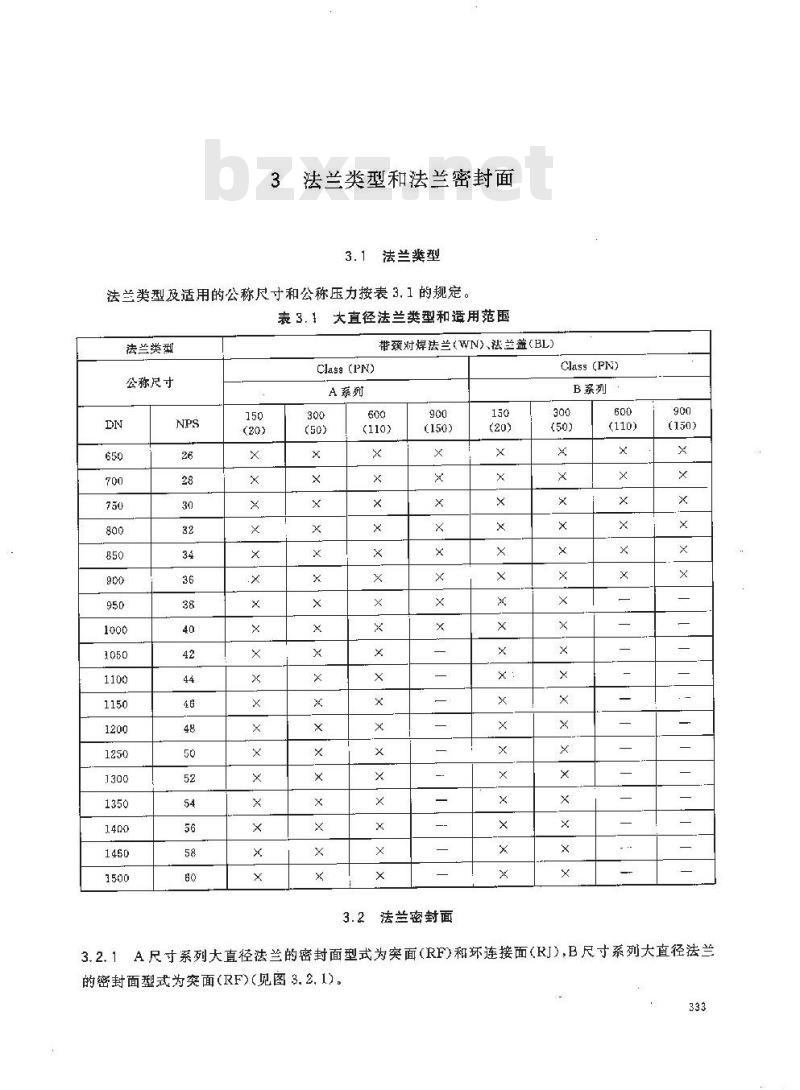法兰类型及适用的公称尺寸和公称压力按表3.1的规定。表3.1大直径法兰类型和适用范围法兰类藏