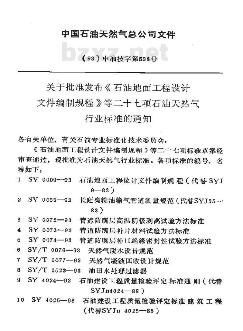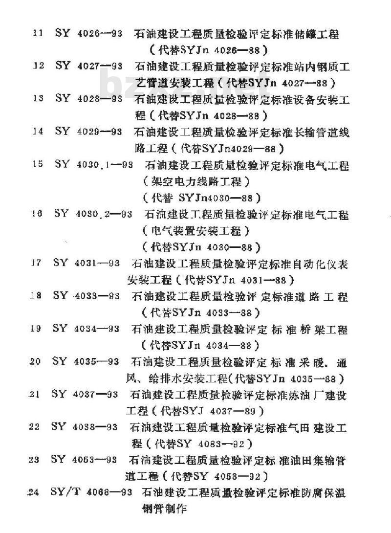 SY4070—93石油天然气管道跨越工程施工及验收规范SY/T4071-93管道下向焊接工艺规程以上标准自一九九四年三月→日起施行。中国石油天然气总公司