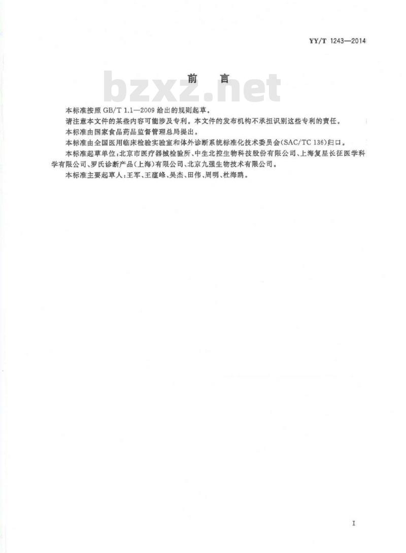 请注意本文件的某些内容可能涉及专利。本文件的发布机构不承担识别这些专利的责任。本标准由国家食品药品监督管理总局提出。本标准由全国医用临床检验实验室和体外诊断系统标准化技术委员会(SAC/TC136)归口。本标准起草单位:北京市医疗器械检验所、中生北控生物科技股份有限公司、上海复星长征医学科学有限公司、罗氏诊断产品(上海)有限公司、北京九强生物技术有限公司。本标准主要起草人:王军、王蕴峰、吴杰、田伟、周明、杜海鸥I