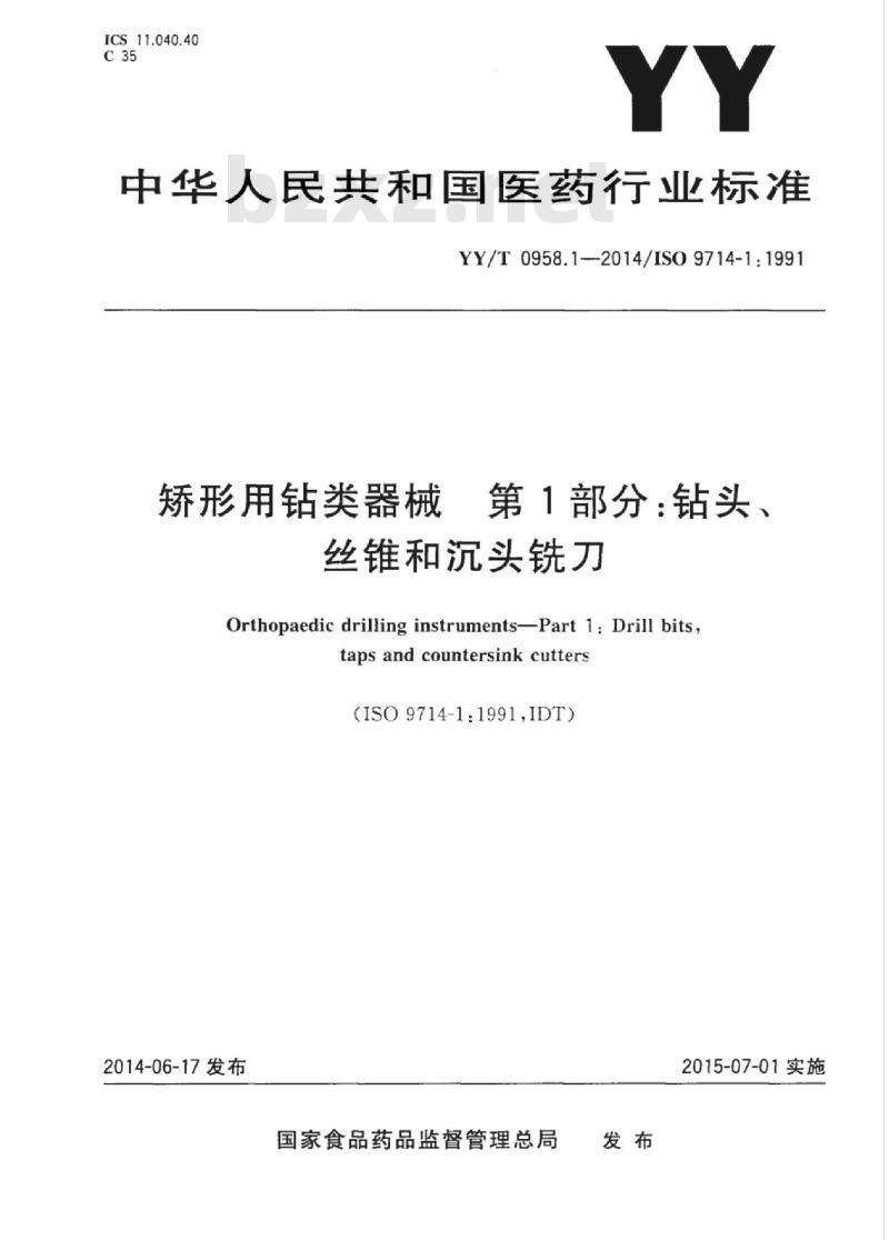 YY/T0958.1—2014/IS09714-1:1991YY/T0958《矫形用钻类器械》拟分部分出版,目前计划发布如下部分:第1部分:钻头、丝锥和沉头铣刀。本部分为YY/T0958的第1部分。