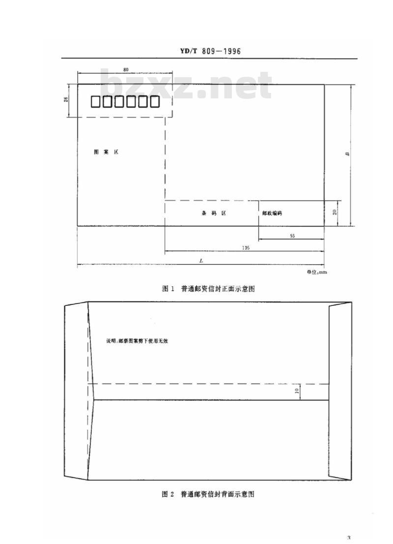5.3.3邮资信封正面右上角应印邮票,邮票的上沿距信封上边5mm,邮票的右沿距信封右边5mm。5.3.4纪念邮资信封正面的美术图案区设在左方,距上边26mm,距右边135mm范围内,见图3。5.3.5邮资信封正面距右边55~135mm以内、底边20mm以下的位置为条码打印区,此区应保持空白,见图1、图3。