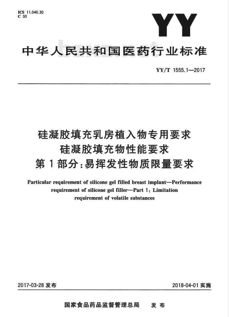 YY/T 1555. 1-2017.Particular requirement of silicone gel filld breast implant- Performance requirement of silicone gel filler -Part 1: Limitation requirement of volatile substances.
