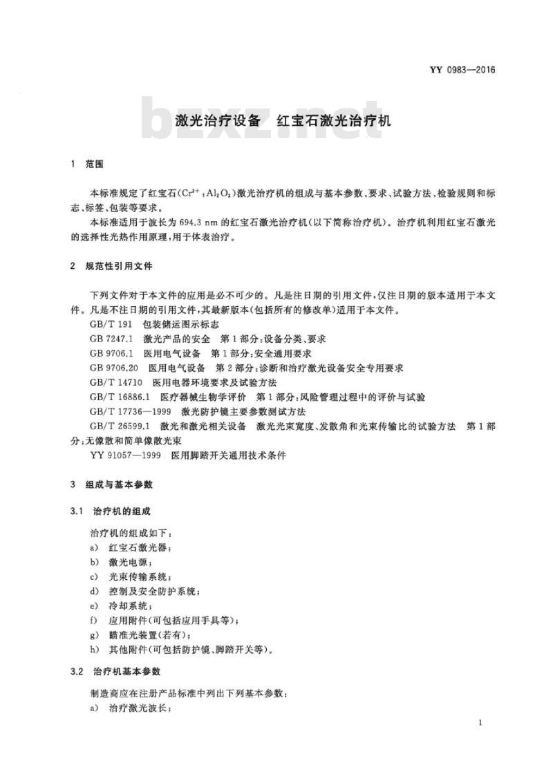 - YY 0983-2016 激光治疗设备红宝石激光治疗机