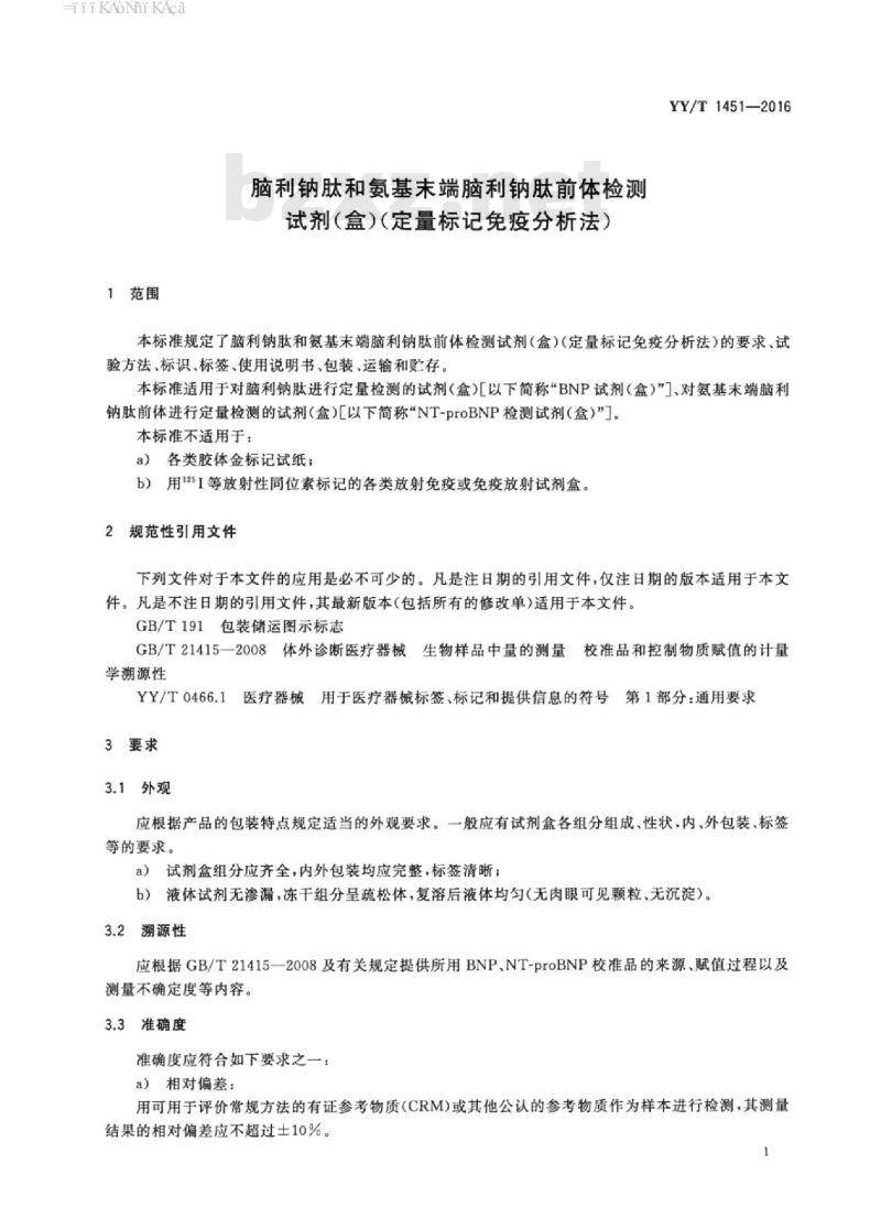 - YY/T 1451-2016 脑利钠肽和氨基末端脑利钠肽前体检测试剂(盒)(定量标记免疫分析法)