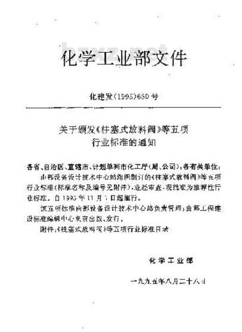 各省、自治唇、支转市、计划单列市化工厅(同、公司),各有关单位;中部设备该计技术中心站组织制订的柱综式效料阀等危项行业标(标雅名称及编号叉附件),业经市查,现批准为推荐性行业标准。自19年11月:口起随行。该五点标润出部设备设计转术中心站负责管理,由部工程设标准编辑中心负改出放、发行,附件:柱望式放料复等五项行业标准日求化学工业部