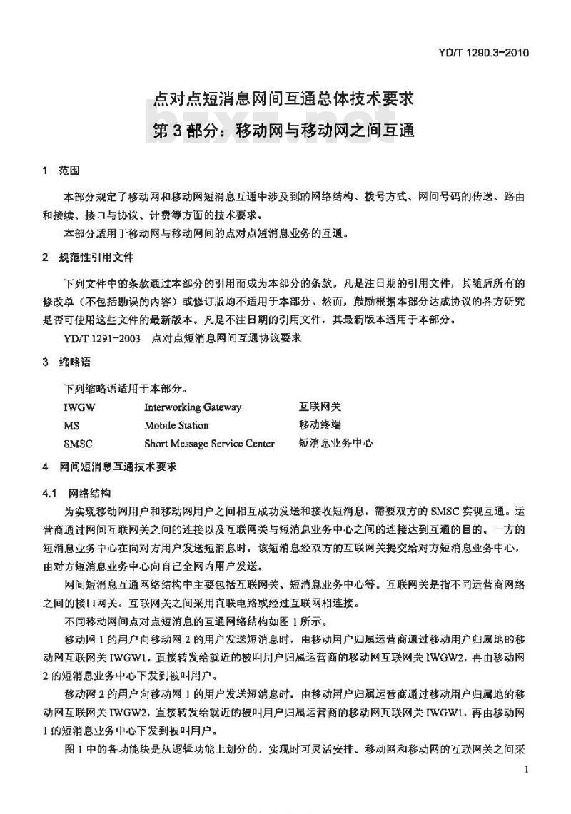 YD/T 1290.3规定了移动网和移动网短消息互通中涉及到的网络结构、拨号方式、网间号码的传送、路由和接续、接口与协议、计费等方面的技术要求。