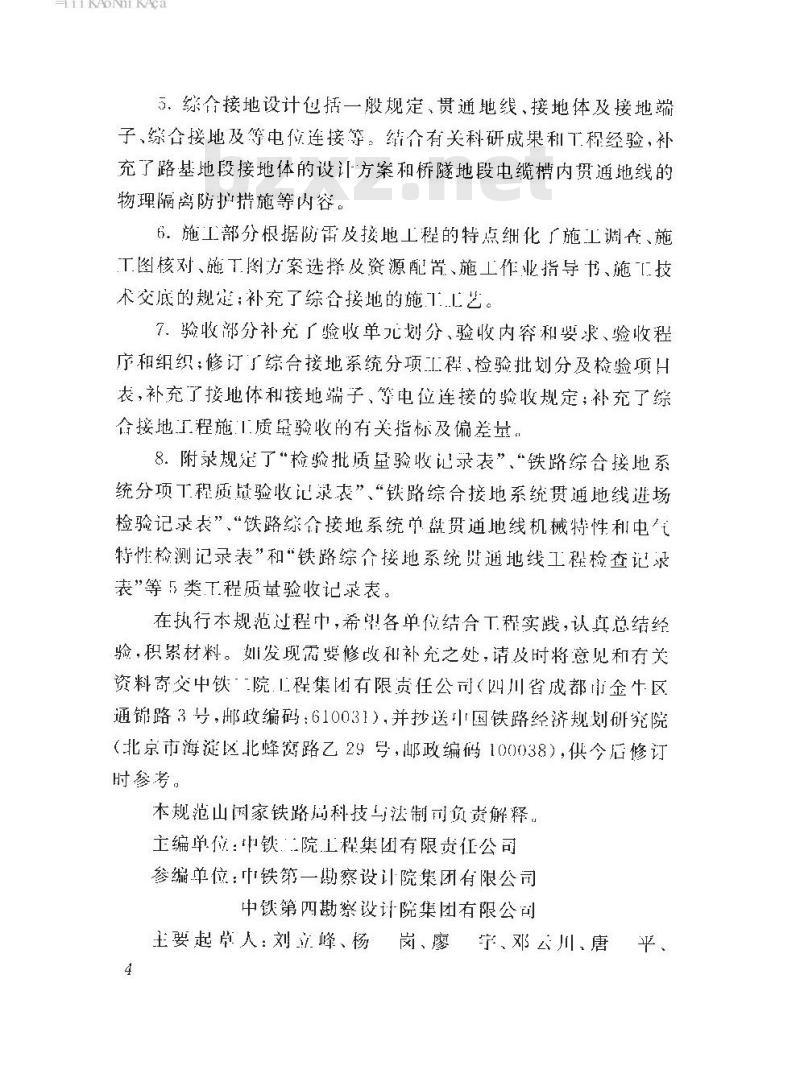 6。施工部分根据防雷及接地上工程的特点细化广施工调查、施工图核对、施工图方案选择及资源配置、施工作业指导书、施技术交底的规楚;补充了综合接地的施1艺。7验收部分补充厂验收单光划分、验收内容和要求、验收程序和组织;修订厂综合接地系统分项工程、检验批划分及检验项H表,补充了接地体和接地端子,等电位连接的验收规定;补充了练合接地工程施1质量验收的有关指标及偏差量。8.附录规烂了“检验批质量验收记录表”、“铁路综合接地系统分项工程质量验收记录表”“铁路综合接地系统贯通地线进场检验记录衣”“铁路练金接地系统单盘贯迪地线机械特性利电特性检测记录表”和“铁路综个接地系统贯通地线工程检查记求表”等5类下程质量验收记录表。在执行本规范过程中,希望各单位结合工程实践,认真总结经验,积累材料。如发现需修改仙补充之处,请及时将意见和有关资料寄交中铁-院1程集附有限贡任公司(四川省成都市金牛区通锦路3号,邮政编码:610031)并抄送中国铁路经济规划研究院(北京市海淀区北峰路乙29号,邮政编码100038),供今居修订时参考。