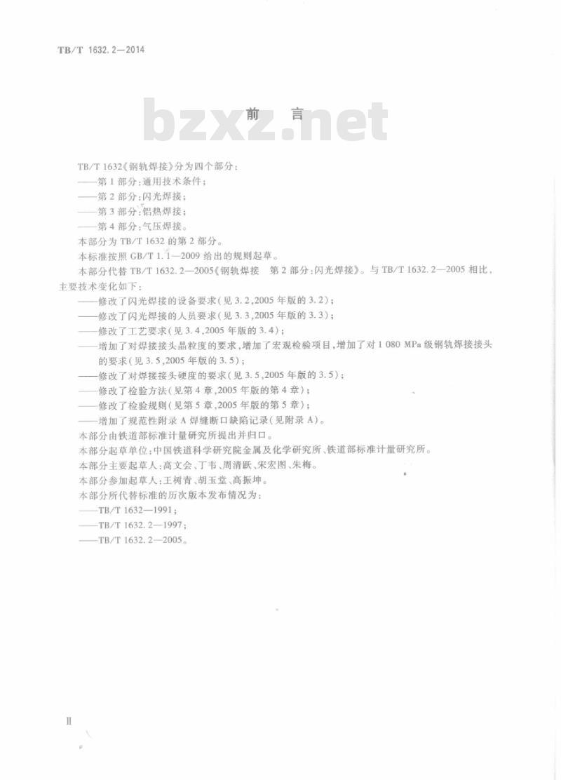 修改了闪光焊接的设备要求(见3.2,2005年版的3.2):修改了闪光焊接的人员要求(见3.3,2005年版的3.3);修改了工艺要求(见3.4,2005年版的3.4);增加了对焊接接头晶粒度的要求,增加了宏观检验项目,增加了对1080MPa级钢轨焊接接头的要求(见3.5,2005年版的3.5);修改了对焊接接头硬度的要求(见3.5,2005年版的3.5);修改了检验方法(见第4章,2005年版的第4章);修改了检验规则(见第5章,2005年版的第5章);增加了规范性附录A焊缝断口缺陷记录(见附录A)。本部分由铁道部标准计量研究所提出并归口。本部分起草单位:中国铁道科学研究院金属及化学研究所、铁道部标准计量研究所。本部分主要起草人:高文会、丁韦、周清跃、宋宏图、朱梅。本部分参加起草人:王树青、胡玉堂、高振坤。本部分所代替标准的历次版本发布情况为:TB/T1632—1991;