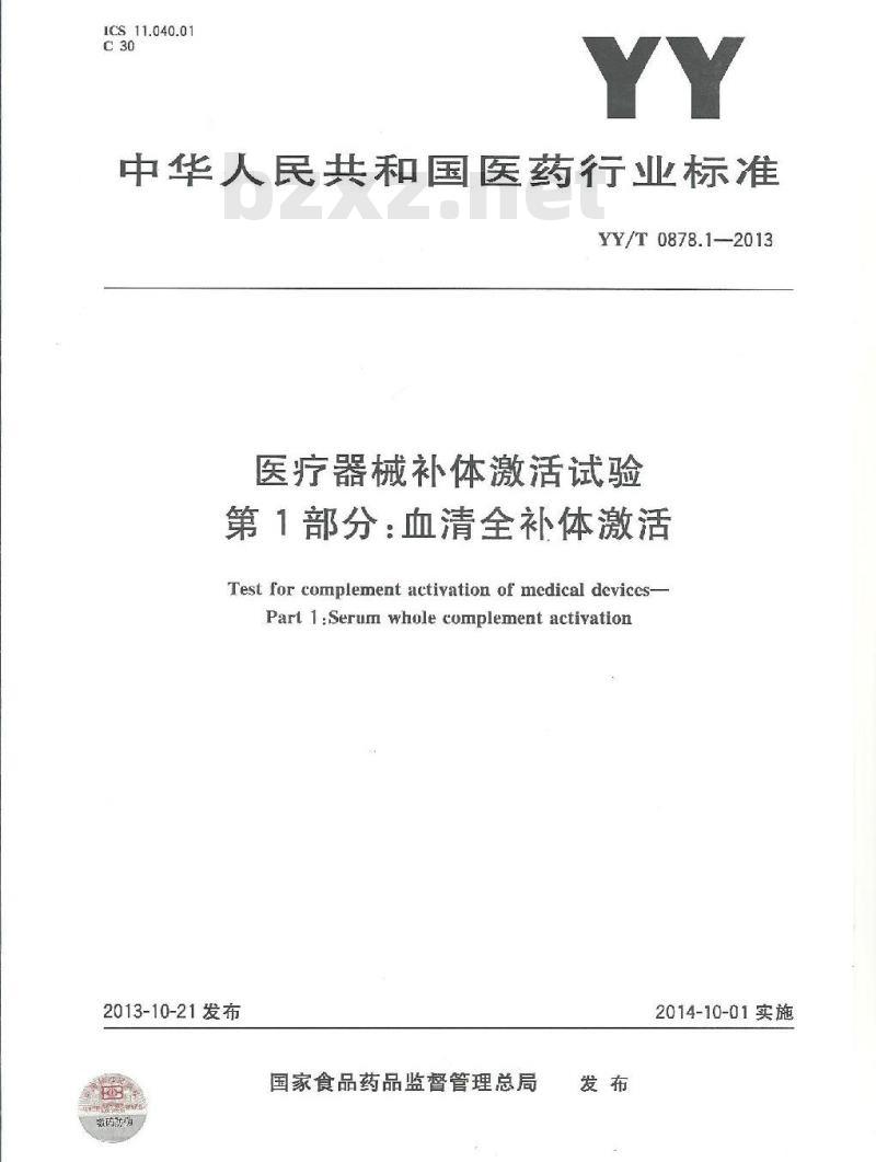 - YY/T 0878.1-2013 医疗器械补体激活试验 第1部分:血清全补体激活
