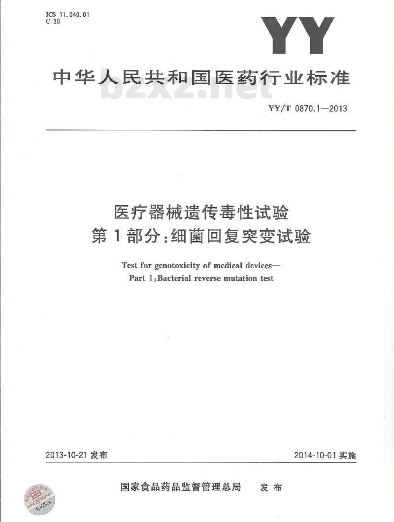 - YY/T 0870.1-2013 医疗器械遗传毒性试验 第1部分:细菌回复突变试验