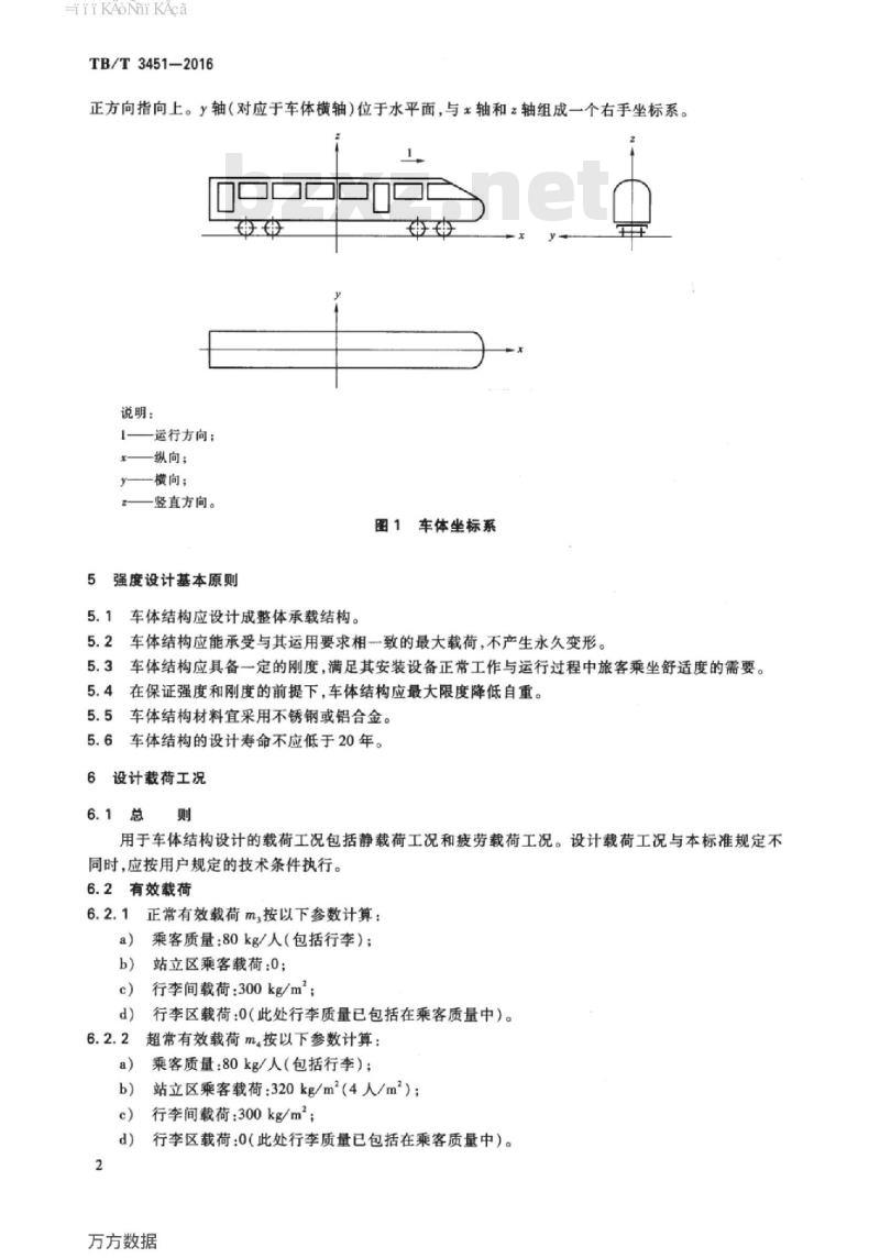 5.1车体结构应设计成整体承载结构。5.2车体结构应能承受与其运用要求相一致的最大载荷,不产生永久变形。车体结构应具备一定的刚度,满足其安装设备正常工作与运行过程中旅客乘坐舒适度的需要。5.33