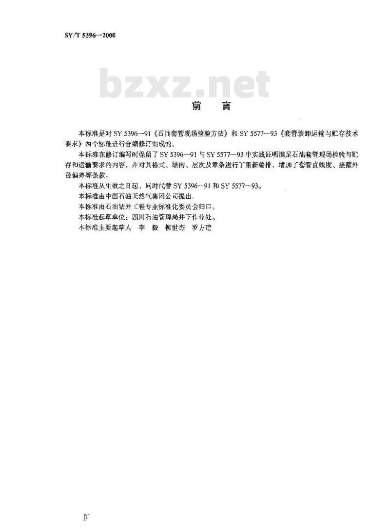 本标准从生效之日起,同时代替SY5396--91和SY5577-93。本标雄由中国石油天然气集团公司提出:本标准由石油钻井工程专业标准化委员会归口。本标准起草单位:四川石油管理局井下作业处,本标推主要起草人李毅柳世杰