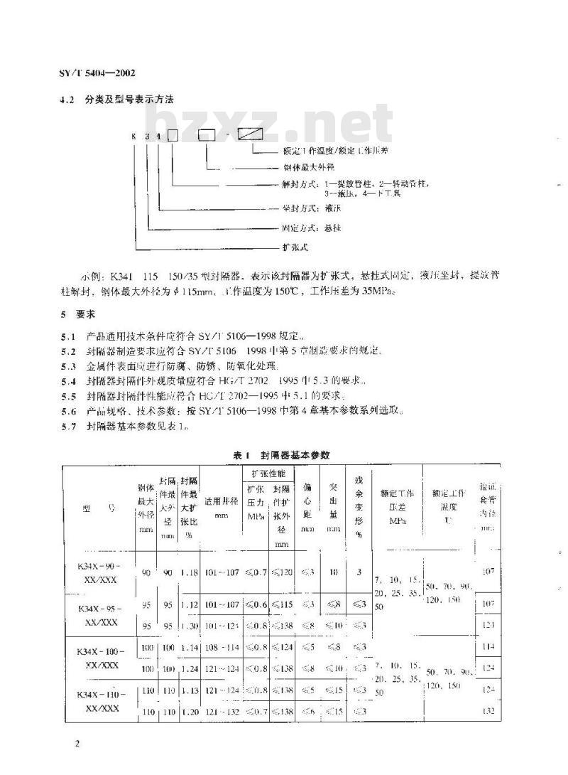 小例:K341115150/35型封隔器,表示该封隔器为扩张式,悬挂式固定,液坐封,提放背柱解封,钢体最大外径为115mm,1作温度为150℃,工作压差为35MPa。5要求