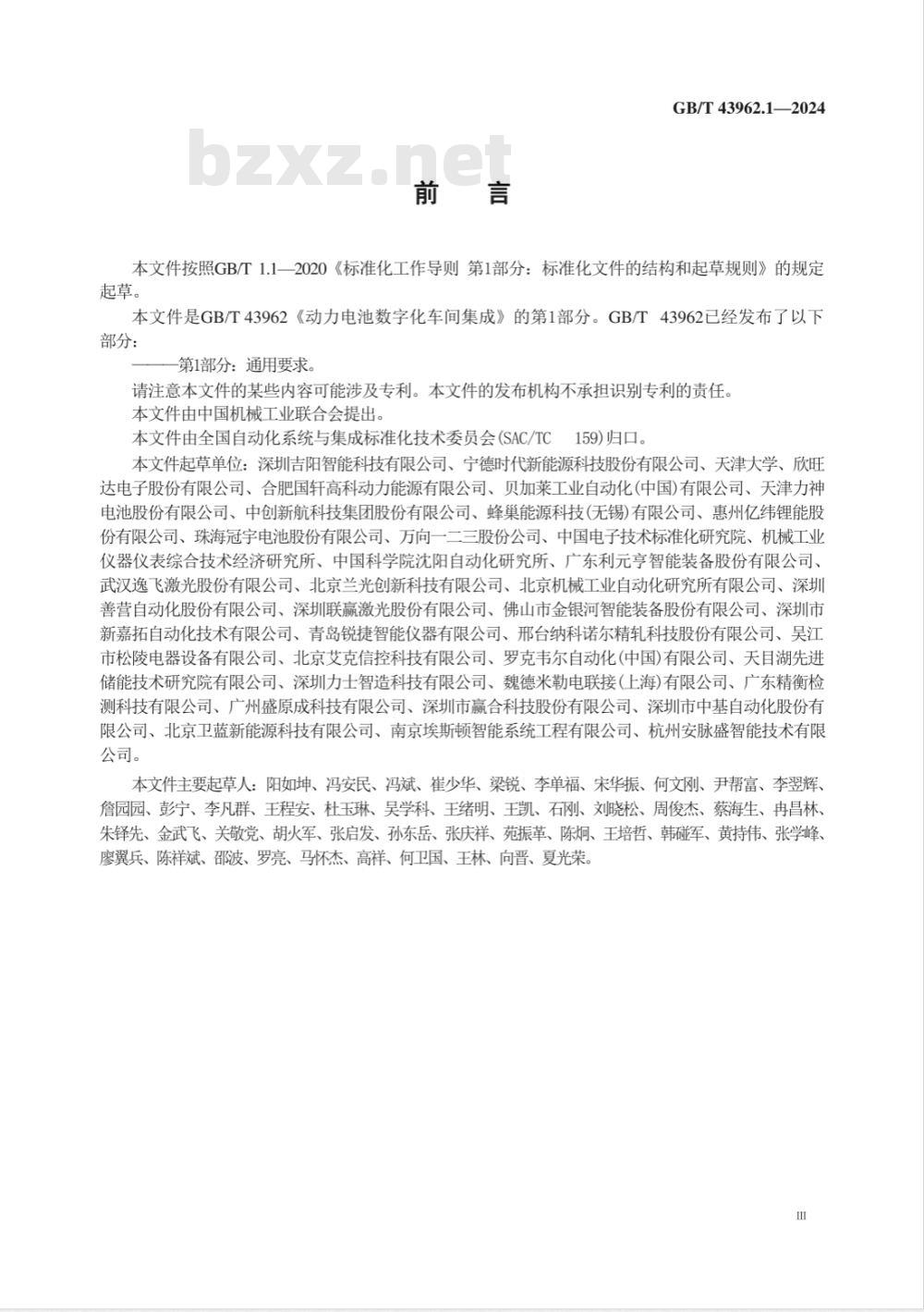 请注意本文件的某些内容可能涉及专利。本文件的发布机构不承担识别专利的责任。本文件由中国机械工业联合会提出。本文件由全国自动化系统与集成标准化技术委员会(SAC/TC159)归口。本文件起草单位:深圳吉阳智能科技有限公司、宁德时代新能源科技股份有限公司、天津大学、欣旺达电子股份有限公司、合肥国轩高科动力能源有限公司、贝加莱工业自动化(中国)有限公司、天津力神电池股份有限公司、中创新航科技集团股份有限公司、蜂巢能源科技(无锡)有限公司、惠州亿纬锂能股份有限公司、珠海冠宇电池股份有限公司、万向一二三股份公司、中国电子技术标准化研究院、机械工业仪器仪表综合技术经济研究所、中国科学院沈阳自动化研究所、广东利元亨智能装备股份有限公司、武汉逸飞激光股份有限公司、北京兰光创新科技有限公司、北京机械工业自动化研究所有限公司、深圳善营自动化股份有限公司、深圳联赢激光股份有限公司、佛山市金银河智能装备股份有限公司、深圳市新嘉拓自动化技术有限公司、青岛锐捷智能仪器有限公司、邢台纳科诺尔精轧科技股份有限公司、吴江市松陵电器设备有限公司、北京艾克信控科技有限公司、罗克韦尔自动化(中国)有限公司、天自湖先进储能技术研究院有限公司、深圳力士智造科技有限公司、魏德米勒电联接(上海)有限公司、广东精衡检测科技有限公司、广州盛原成科技有限公司、深圳市赢合科技股份有限公司、深圳市中基自动化股份有限公司、北京卫蓝新能源科技有限公司、南京埃斯顿智能系统工程有限公司、杭州安脉盛智能技术有限公司。