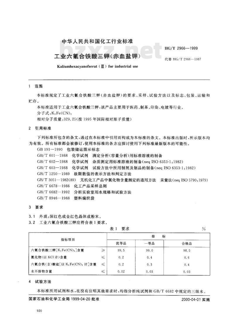 工业六氰合铁酸三钾(赤血盐钾)Kaliumhexacyanoferrat ( II) for industrial useHG/T 2966-1999