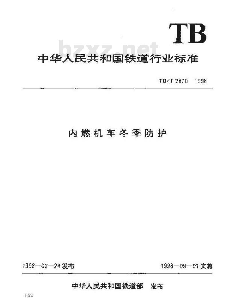 TB/T 2870列出了内燃机车在寒冷的天气条件下易出现故障的部位及原因,规定了内燃机车冬季防护的措施。