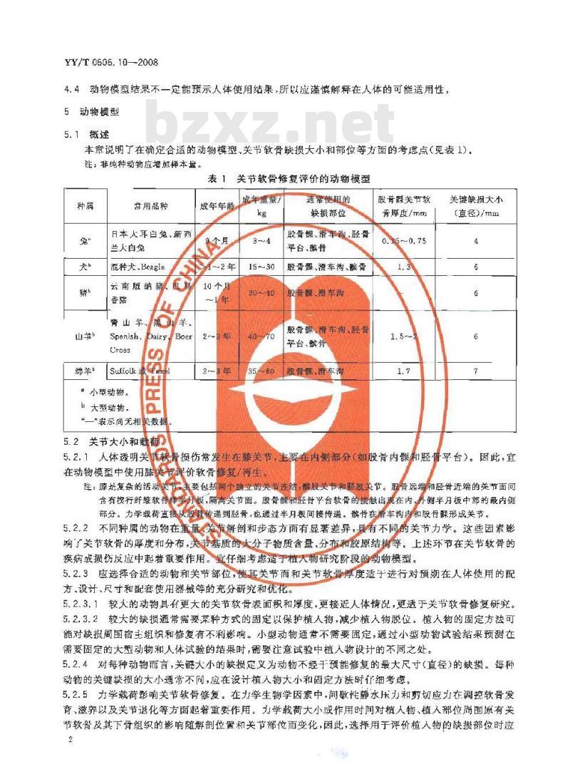 YY/T 0606. 10描述了兔.犬、猪、山羊、绵羊等不同种属的动物模型和相应的试验程序,以及形态学、组织生物化学和生物力学分析等结果测定和评价的方法。
