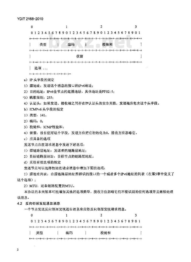 YD/T 2168规定了IPv6反向邻居发现(ND)协议,主要包括IPv6反向邻居发现协议的消息、选项的格式以及协议的具体执行过程。