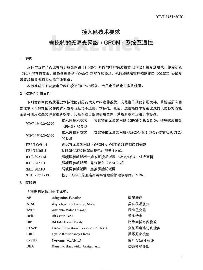 YD/T 2157规定了吉比特的无源光网络(GPON)系统的特理媒质相关(PMD)层互通要求、传输汇聚(TC)层互通要求、操作管理维护(OAM)功能互通要求、光网络终端管理控制接口(OMCI) 协议互通要求和业务相关功能互通要求。