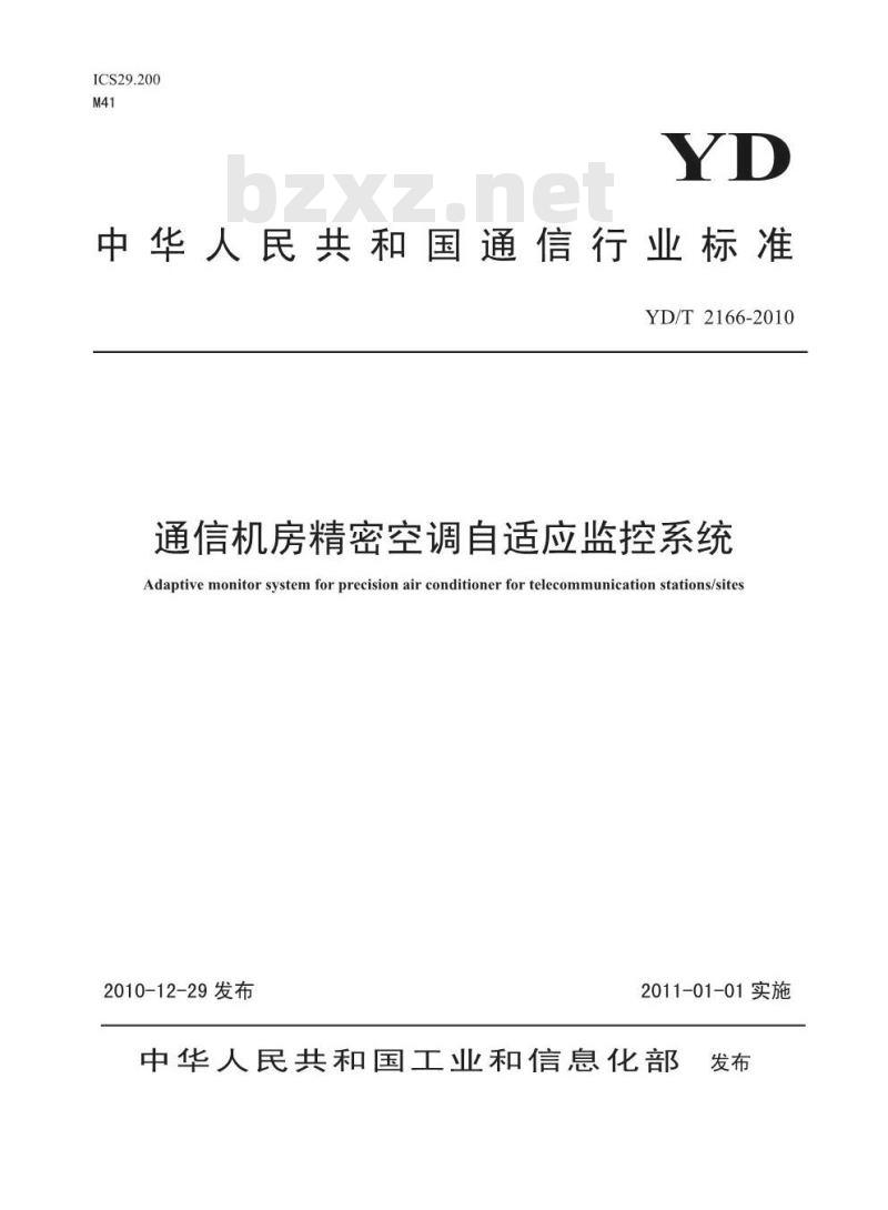 YD/T 2166规定了通信机房精密空调自适应监控系统的定义、结构、技术要求、功能要求及系统硬件等。
