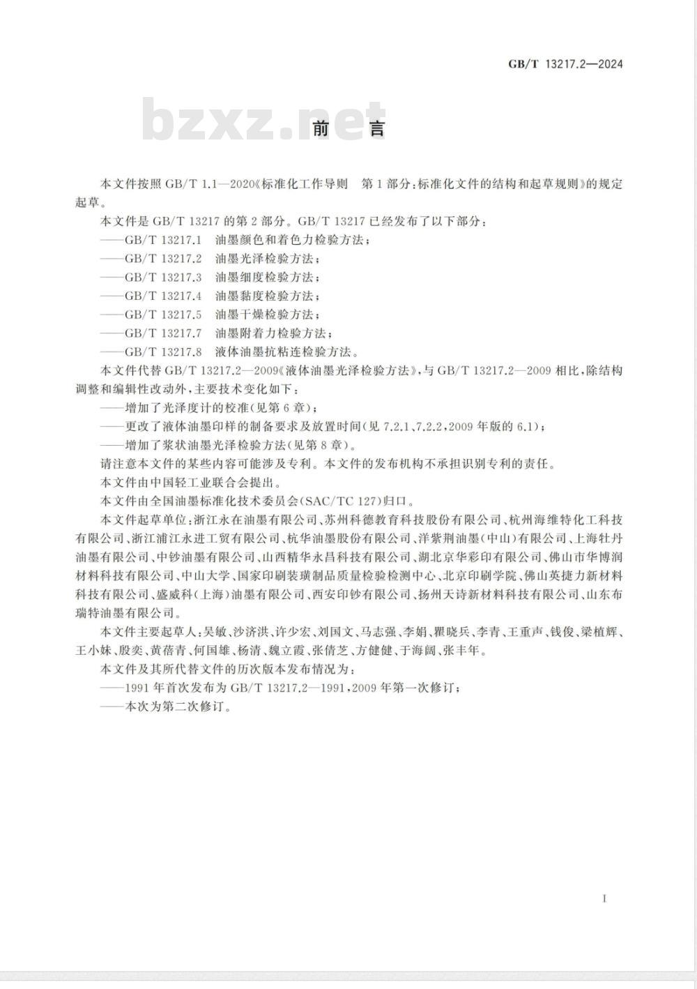 本文件代替GB/T13217.2一2009《液体油墨光泽检验方法》,与GB/T13217.2一2009相比,除结构调整和编辑性改动外,主要技术变化如下:增加了光泽度计的校准(见第6章);更改了液体油墨印样的制备要求及放置时间(见7.2.1、7.2.2,2009年版的6.1);增加了浆状油墨光泽检验方法(见第8章)。请注意本文件的某些内容可能涉及专利。本文件的发布机构不承担识别专利的责任。本文件由中国轻工业联合会提出。本支件由全国油墨标准化技术委员会(SACTC127)归口。本文件起草单位:浙江永在油墨有限公司、苏州科德教育科技股份有限公司、杭州海维特化工科技有限公司、浙江浦江永进工贸有限公司、杭华油墨股份有限公司、洋紫荆油墨(中山)有限公司、上海牡丹油墨有限公司、中钞油墨有限公司、山西精华永昌科技有限公司、湖北京华彩印有限公司、佛山市华博润材料科技有限公司、中山大学、国家印刷装璜制品质量检验检测中心、北京印刷学院、佛山英捷力新材料科技有限公司、盛威科(上海)油墨有限公司、西安印钞有限公司、扬州天诗新材料科技有限公司、山东布瑞特油墨有限公司。