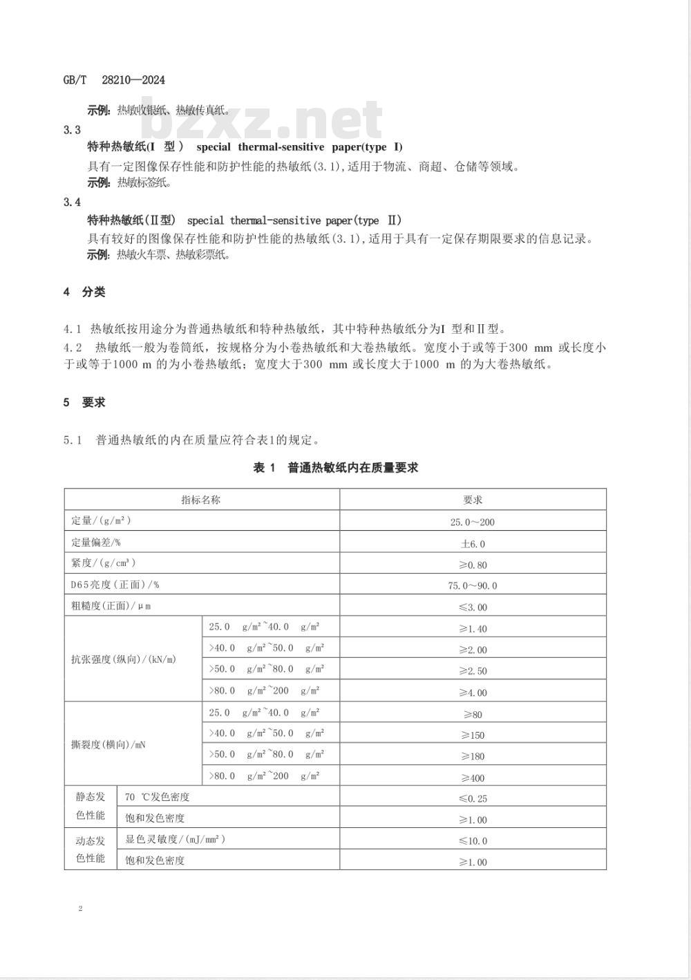 本文件规定了热敏纸的技术要求、检验规则、标志、包装、运输、贮存,描述了相应的试验方法,给出了有关分类的信息,界定了相应的术语和定义。本文件适用于通过热作用显色为黑色图文的各类热敏纸的生产、检验和销售。2规范性引用文件