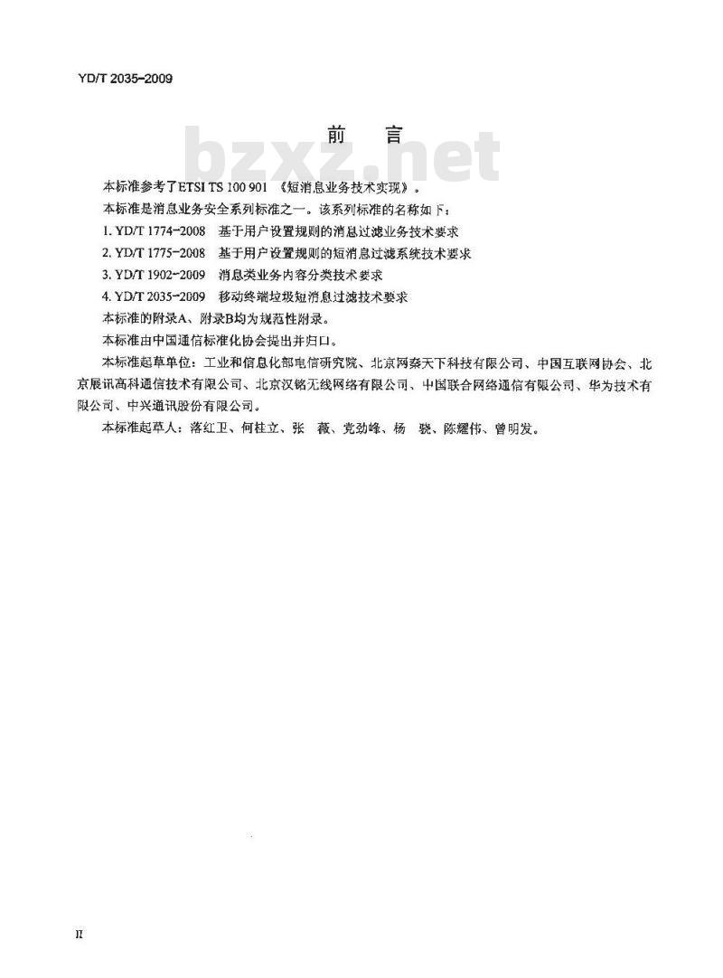本标准参考了ETSITS100901《短消息业务技术实现》。本标准是消息业务安全系列标准之一。该系列标准的名称如下:1.YD/T1774-2008基于用户设置规则的消息过滤业务技术要求2.YD/T1775-2008基于用户设置规则的短消息过滤系统技术要求3.YD/T1902~2009消息类业务内容分类技术要求4.YD/T2035-2009移动终端垃圾短消息过滤技术要求本标准的附录A、附录B均为规范性附录。本标准由中国通信标准化协会提出并归口。本标准起草单位:工业和信总化部电信研究院、北京网秦天下科技有限公司、中国互联网协会、北京展讯高科通信技术有限公司、北京汉铭无线网络有限公司、中国联合网络通信有限公司、华为技术有限公司、中兴通讯股份有限公司。本标准起草人:落红卫、何桂立、张薇、党劲峰、杨骁、陈耀伟、曾明发。引言