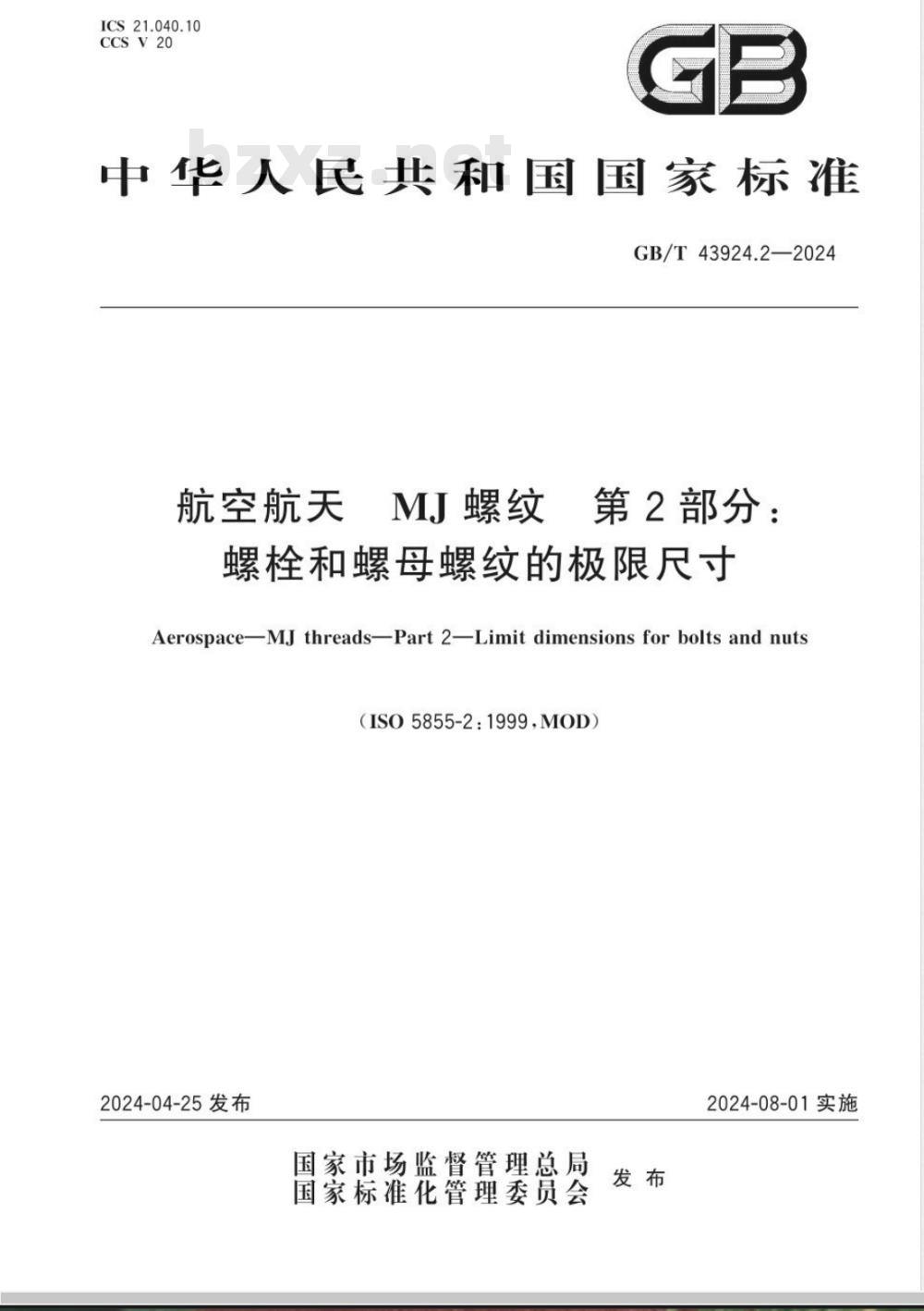 - GB/T 43924.2-2024航空航天 MJ螺纹 第2部分:螺栓和螺母螺纹的极限尺寸