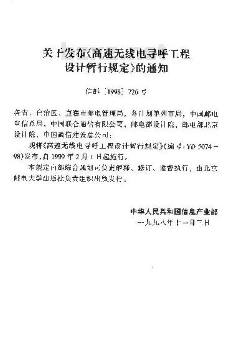 现将高速无线电字呼工程设计智行划定》(编:YD5074-99)安布,口1999年2月1H起於行。本规定部综合滤划贷本解释、接订、监咨执行,由北市邮市大学山愿社负支生出改发行:中华人民共和国信息产业部