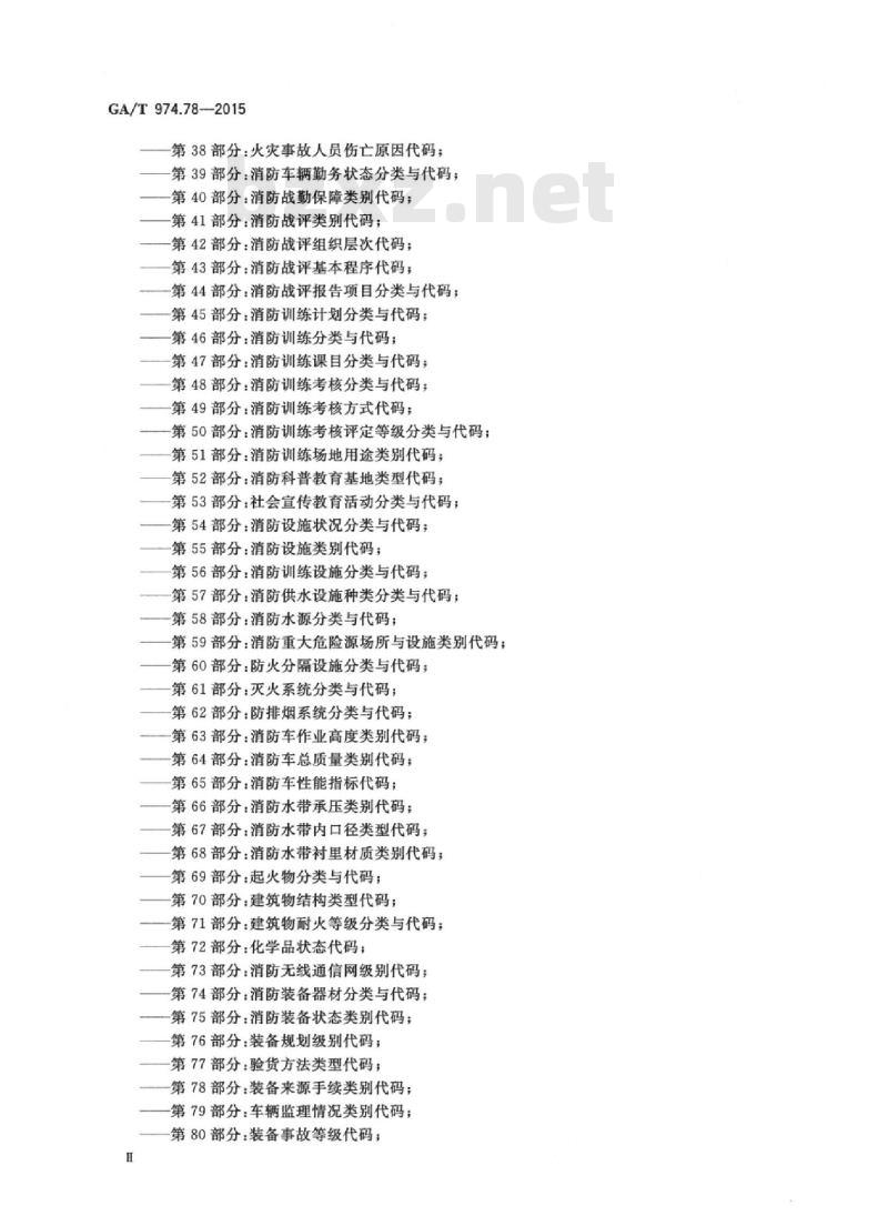 第38部分:火灾事故人员伤亡原因代码;第39部分:消防车辆勤务状态分类与代码;第40部分:消防战勤保障类别代码;第41部分:消防战评类别代码;第42部分:消防战评组织层次代码;第43部分:消防战评基本程序代码;第44部分:消防战评报告项目分类与代码;第45部分:消防训练计划分类与代码;第46部分:消防训练分类与代码;第47部分:消防训练课目分类与代码;第48部分:消防训练考核分类与代码第49部分:消防训练考核方式代码;第50部分:消防训练考核评定等级分类与代码:第51部分:消防训练场地用途类别代码;第52部分:消防科普教育基地类型代码;第53部分:社会宣传教育活动分类与代码;第54部分:消防设施状况分类与代码;第55部分:消防设施类别代码;第56部分:消防训练设施分类与代码:第57部分:消防供水设施种类分类与代码;第58部分:消防水源分类与代码;第59部分:消防重大危险源场所与设施类别代码;第60部分:防火分隔设施分类与代码;第61部分:灭火系统分类与代码;第62部分:防排烟系统分类与代码;第63部分:消防车作业高度类别代码:第64部分:消防车总质量类别代码;第65部分:消防车性能指标代码第66部分:消防水带承压类别代码;第67部分:消防水带内口径类型代码;第68部分:消防水带衬里材质类别代码;第69部分:起火物分类与代码;第70部分:建筑物结构类型代码;第71部分:建筑物耐火等级分类与代码;第72部分:化学品状态代码;