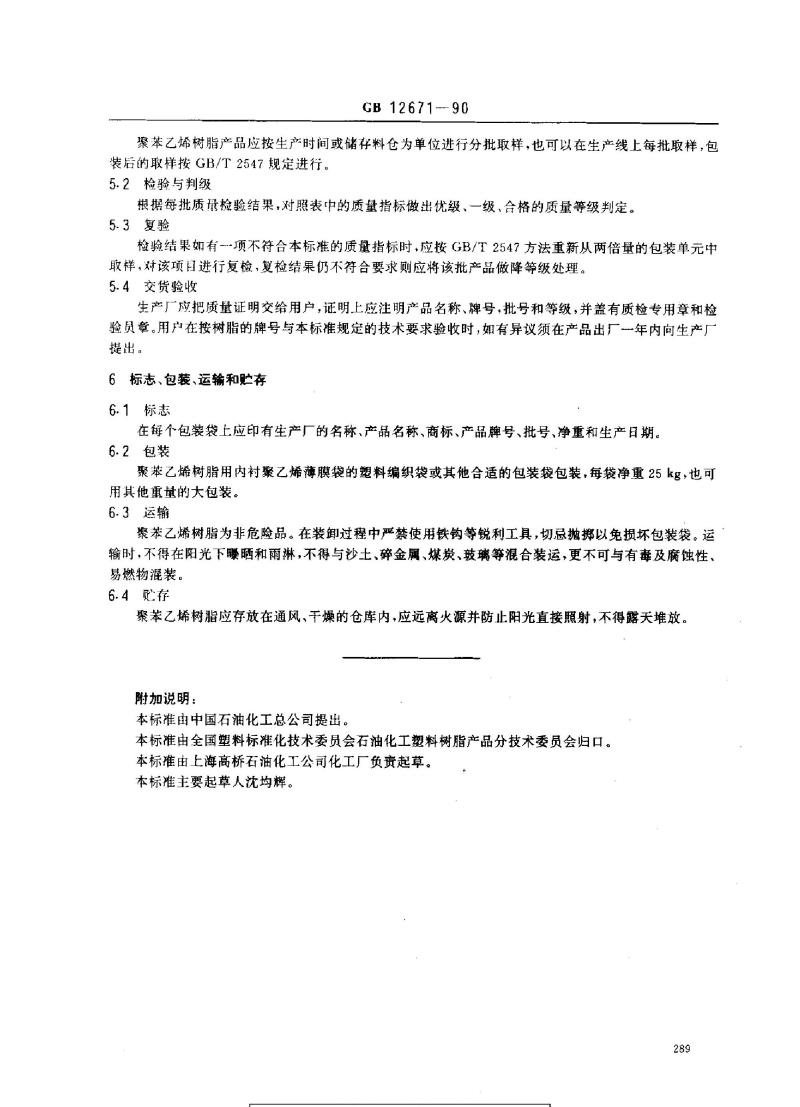 本标准规定了聚苯乙烯树脂的技术要求、试验方法、检验规则及标志、包装、运输、贮存要求。本标准适用于无定形苯乙烯均聚物,也适用于加有着色剂或添加剂的无定形苯乙烯均聚物。本标准不适用于苯乙烯共聚物、苯乙烯衍生物的均聚物及用弹性体聚合物改性的聚苯乙烯树脂和发泡用的聚苯乙烯树脂。 GB 12671-1990 聚苯乙烯树脂 GB12671-1990