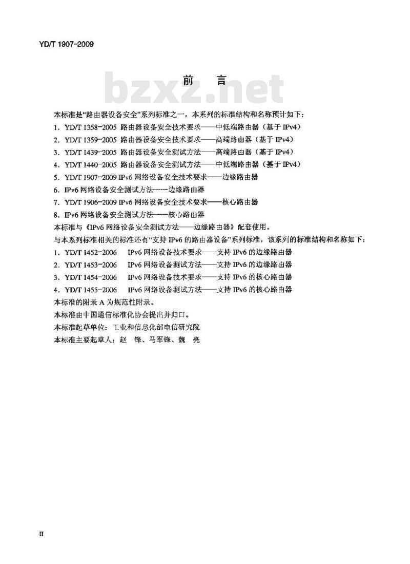 本标准是“路由器设备安全\系列标准之一,本系列的标准结构和名称预计如下:1.YD/T1358-2005路由器设备安全技术要求—一中低端路由器(基于IPv4)2.YD/T1359-2005路由器设备安全技术要求——商端路由器(基于IPv4)3.YD/T1439-2005路由器设备安全测试方法——商端路由器(基于IPv4)4。YD/T1440-2005路由器设备安全测试方法——中低端路由器(基于IPv4)5.YD/T1907-2009IPv6网络设备安全技术要求——边缘路由器6.IPv6网络设备安全测试方法边缘路由器7.YD/T1906-2009IPv6网络设备安全技术要求——核心路由器8.IPv6网络设备安全测试方法一核心路由器本标准与《IPv6网络设备安全测试方法一边缘路由器》配套使用。与本系列标准相关的标准还有“支持Pv6的路由器设备系列标准,该系列的标准结构和名称如下1.YD/T1452-2006IPv6网络设备技术要求——支持IPv6的边缘路由器6IPv6网络设备测试方法——支持Pv6的边缘路由器2. YD/T 1453-2006