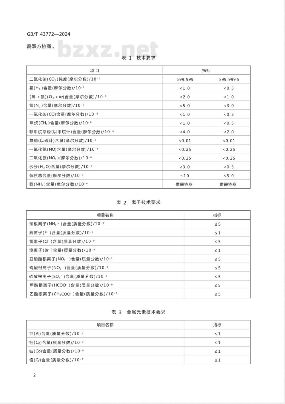 二氧化碳的技术要求应符合表1的规定。离子及金属元素的要求宜符合表2、表3的规定,也可供1