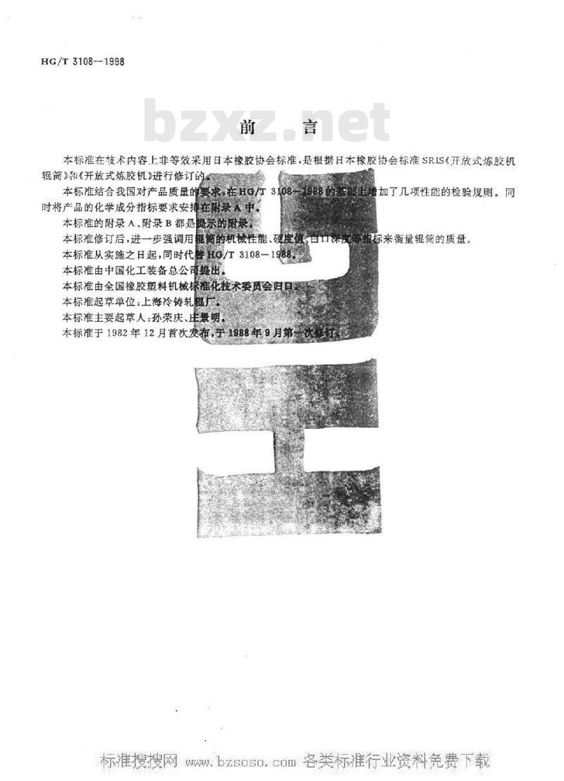 本标准在技术内容上非等效采用日本橡胶协会标准,是根据日本橡胶协会标准SRIS《开放式炼胶机辊简》和《开放式炼胶机》进行修订的。本标准结合我国对产品质量的要求,在HG/T3108—1988的基础上增加了几项性能的检验规则。同时将产品的化学成分指标要求安排在附录A中本标准的附录A、附录B都是提示的附录,本标推修订后,进一步强调用辑筒的机械性能、硬度值、白本标准从实施之日起,同时代替HG/T3108—1988.本标准由中国化工装备总公司提出。本标准由全国橡胶塑料机械标准化技术委员会归口本标准起草单位:上海冷铸轧辐厂本标准主要起草人:孙荣庆、生景明。本标准于1982年12月首次发布,于1988年9月第等指标来衡量辑简的质量。