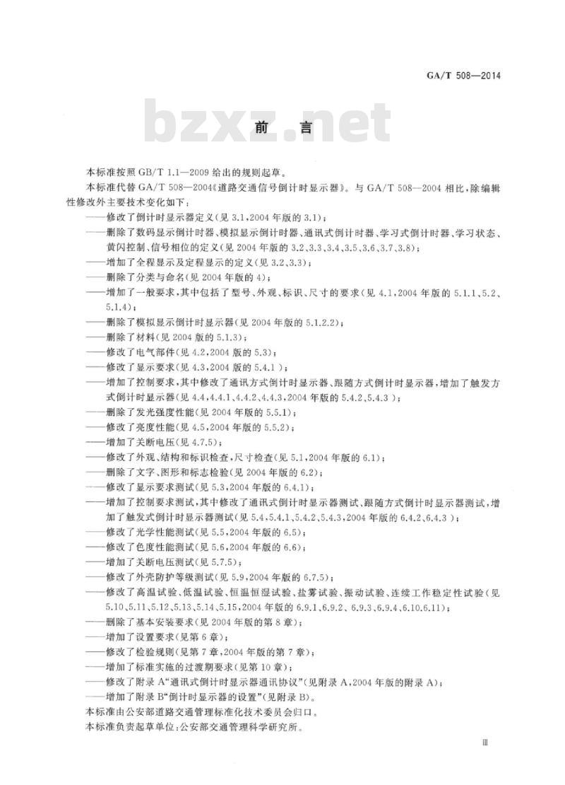 修改了检验规则(见第7章,2004年版的第7章);增加了标准实施的过渡期要求(见第10章);修改了附录A“通讯式倒计时显示器通讯协议”(见附录A,2004年版的附录A);增加了附录B“倒计时显示器的设置”(见附录B)。本标准由公安部道路交通管理标准化技术委员会归口。本标准负责起草单位:公安部交通管理科学研究所。GA/T508—2014