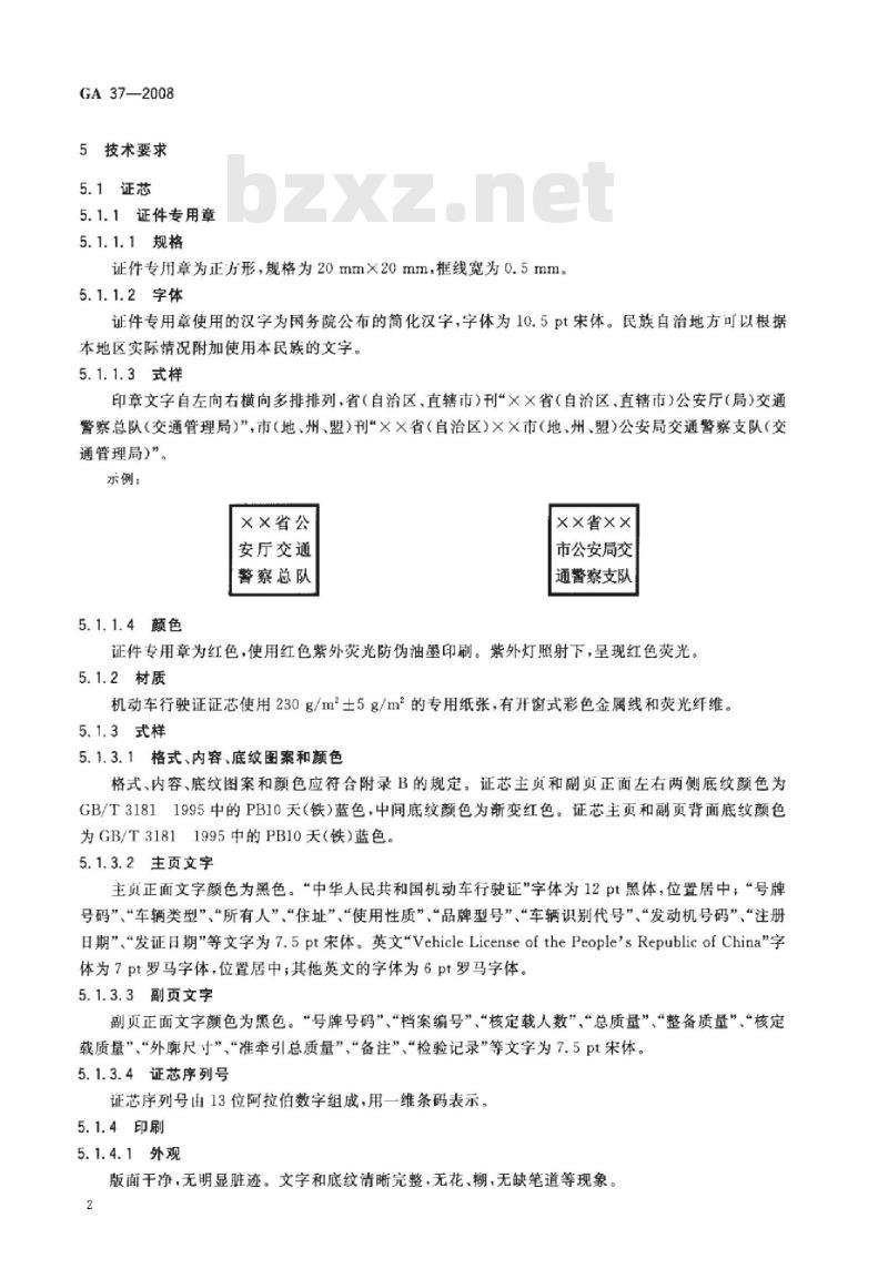 GA 37规定了中华人民共和国机动车行驶证(以下简称“机动车行驶证”)的组成、技术要求、检验方法、检验规则以及包装、标志、运输及贮存和生产管理。